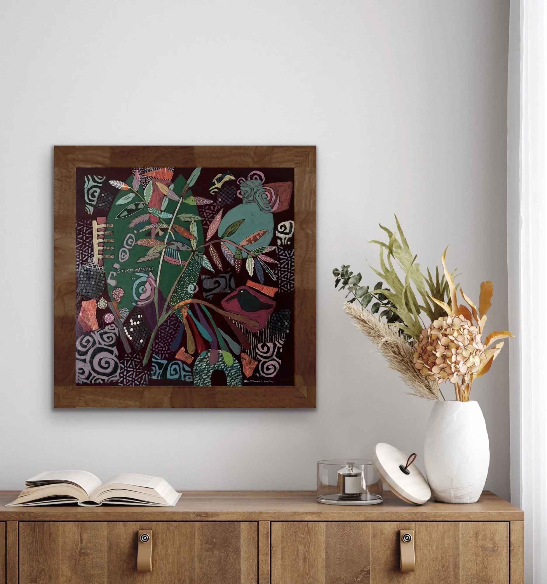 Ash / Nion is part of the Ogham Tree Alphabet series. It began with a drawing of the green ash tree, linked to the ancient Irish alphabet as Nion. The palette draws on natural greens, peach, and deep purplish browns. Favorite symbolic forms surface within the composition, intertwined with a profusion of waving branches that convey strength and resilience.
