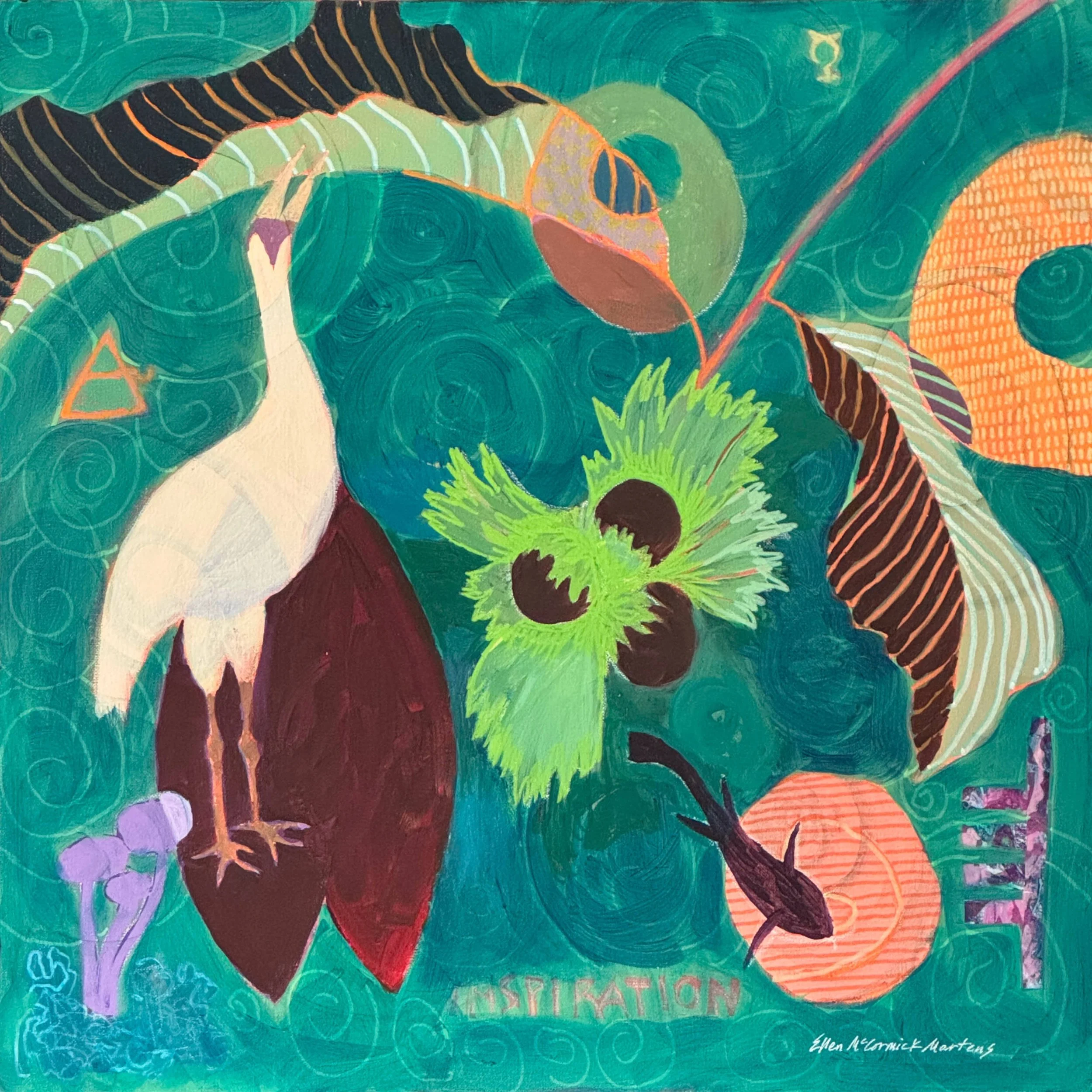 Hazel / Coll is the ninth letter of the Ogham alphabet, associated with wisdom, poetic inspiration, and divination. The crane, sacred bird of Hazel, stands at the center of the composition, while a salmon moves through the swirling depths below — evoking the ancient Celtic myth of the salmon of wisdom nourished by hazelnuts falling into the sacred pool. The word INSPIRATION, written into the painting, names what Hazel offers: the flash of insight that rises from deep knowing.